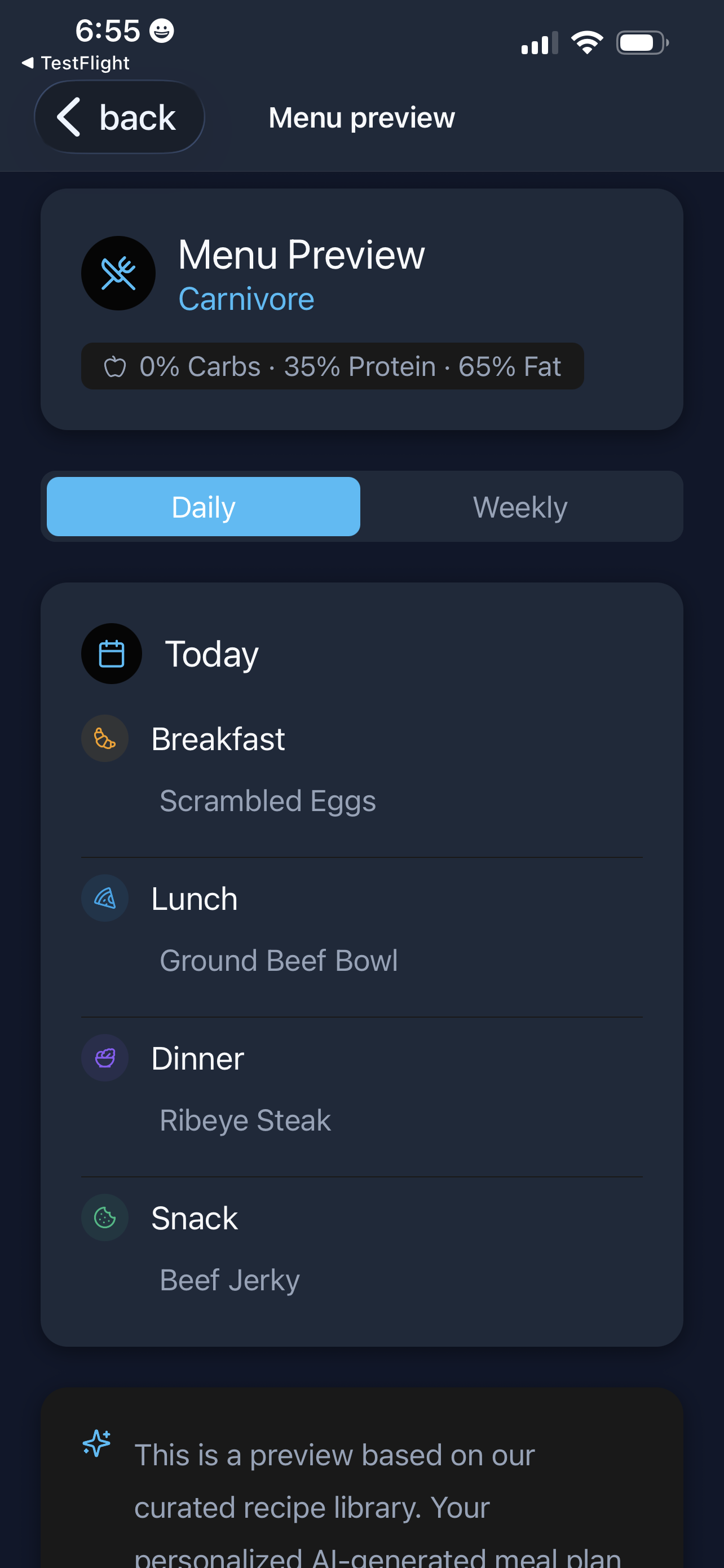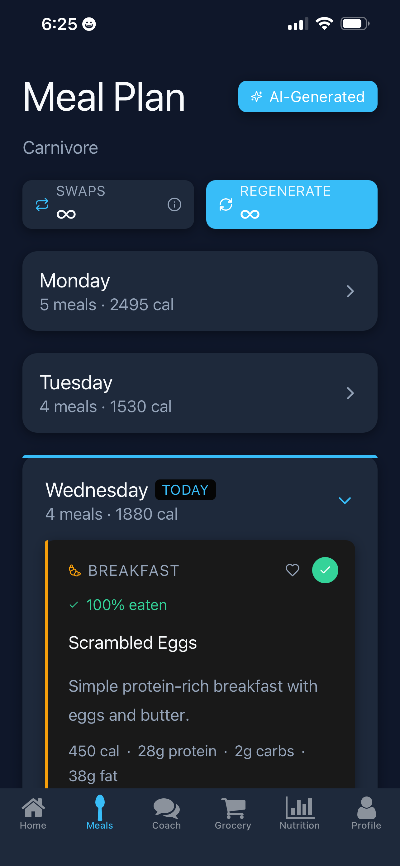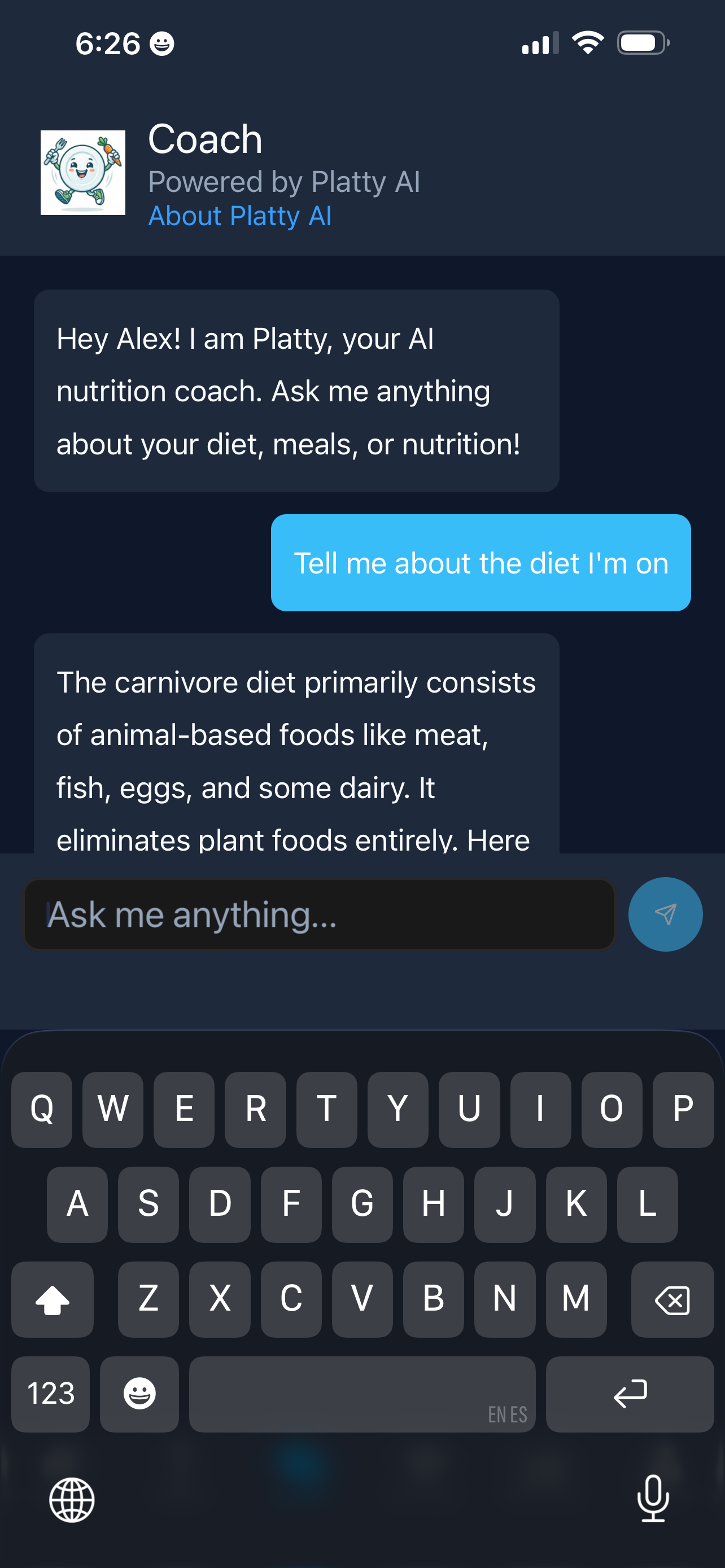 All Day Diet is a personal AI nutrition assistant. You set your goals, dietary rules, and preferences once; the app gives you a tailored meal plan and a smart grocery list so you know what to eat and what to buy. An in-app AI coach (Platty) answers nutrition questions and keeps you on track. It’s like having a dietitian and meal planner in your pocket, without the generic plans—everything is personalized to you.